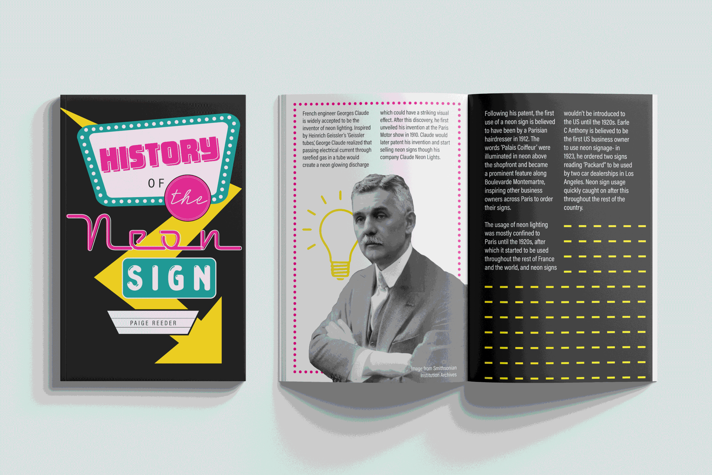 This zine explores the history of neon signage through a series of original illustrations inspired by classic neon signs. The design pairs a two-column grid layout with bright graphic imagery to highlight key moments in neon’s evolution.