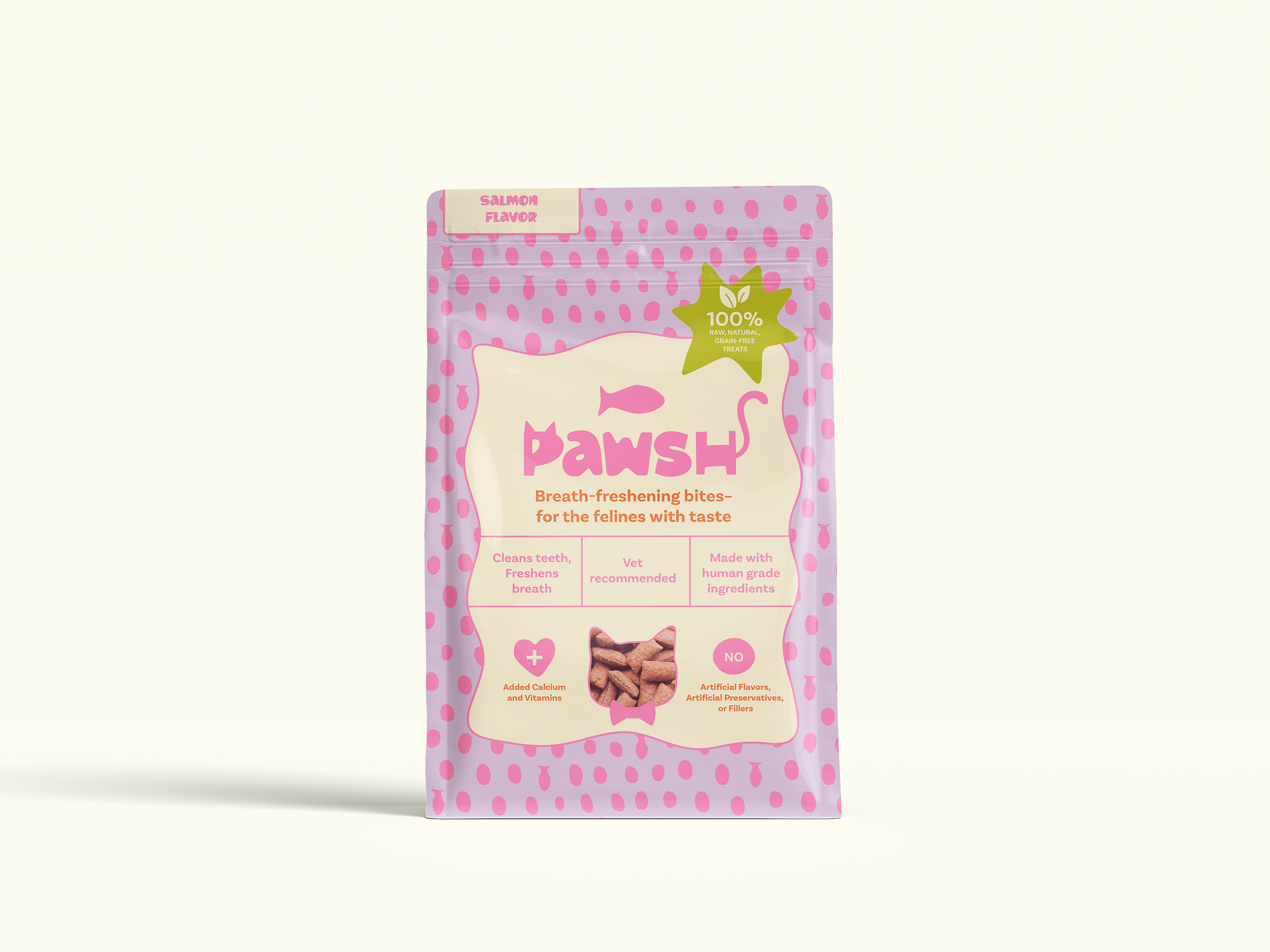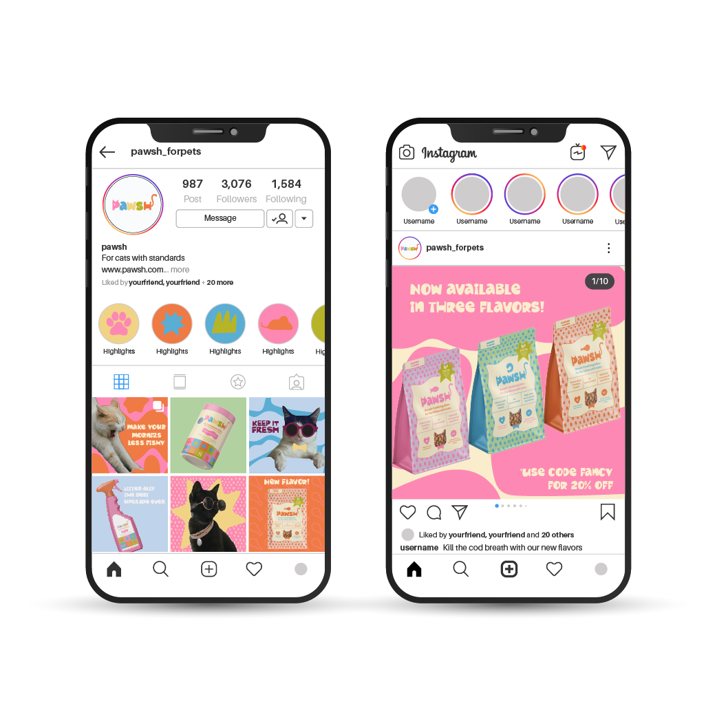 Pawsh is a branding project for a line of cat treats designed to eliminate the infamous “fish” breath. The identity leans into a funky, colorful aesthetic with a dry sense of humor at its core. Bold shapes, bright palettes, and cheeky messaging come together to create a brand that feels fresh and fun.