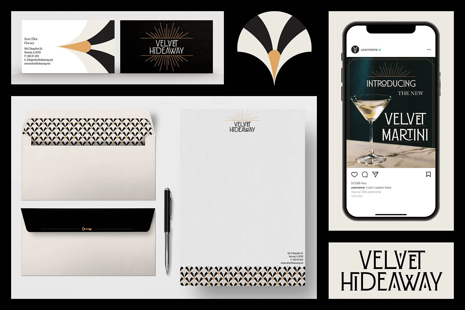 Velvet Hideaway is a brand identity for a sophisticated speakeasy restaurant. The concept began with a geometric tile pattern that established a structured and elegant tone. From here, the visual system developed through simple forms and unique typography, creating a quiet, elevated atmosphere that reflects the restaurant’s intimate character.